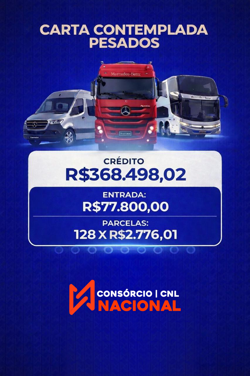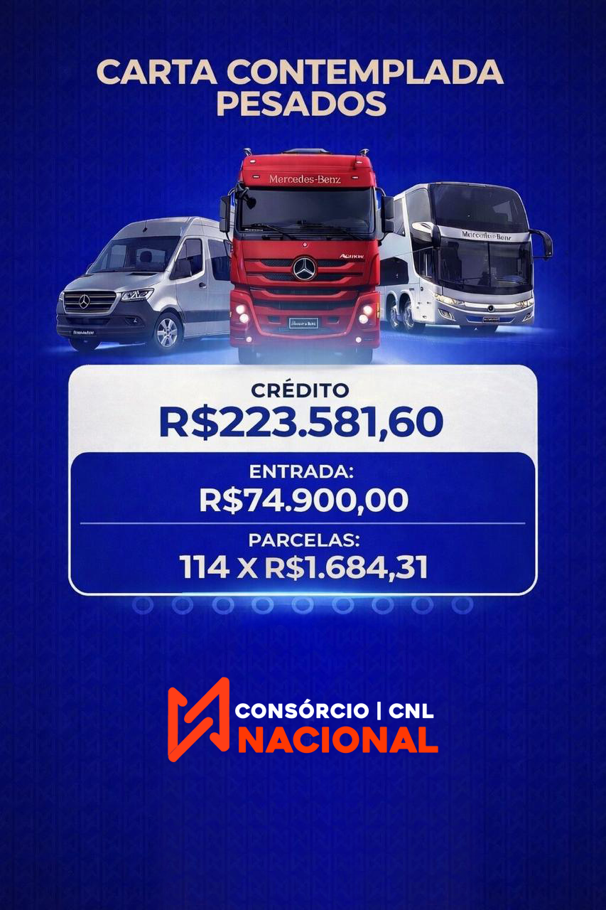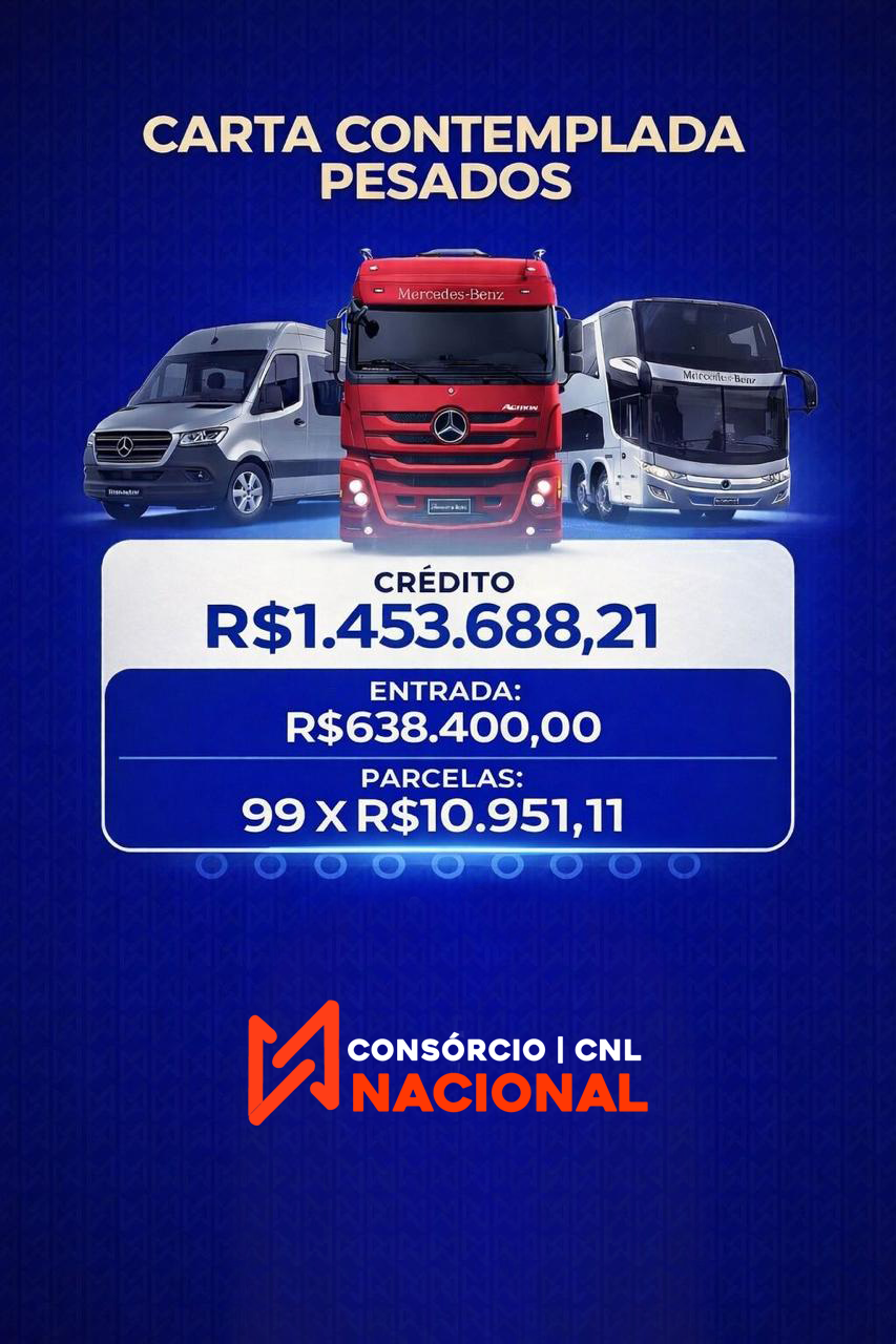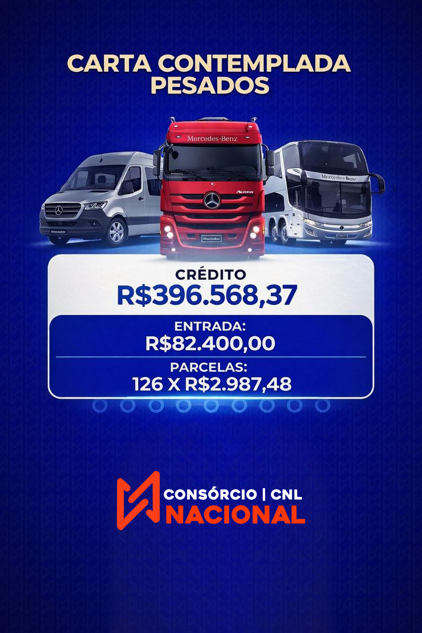 Solução ideal para aquisição de caminhões, ônibus e máquinas pesadas, com planejamento financeiro e condições acessíveis. Perfeito para quem busca ampliar ou renovar a frota com segurança e organização, sem juros.